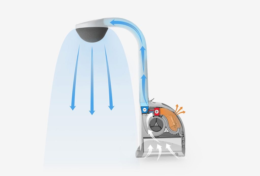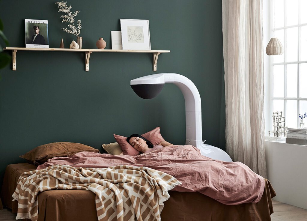 Airsonett Air4 uses the unique and patented technology Temperature-controlled Laminar Airflow (TLA) to control a flow of lightly cooled, filtered clean air towards the breathing zone. The filtered air sinks with the help of gravity and pushes away the particle- and allergen-rich air from the breathing zone. In this way, at least 99.5% of all particles larger than 0.5 μm are blocked from reaching your breathing zone when you sleep.