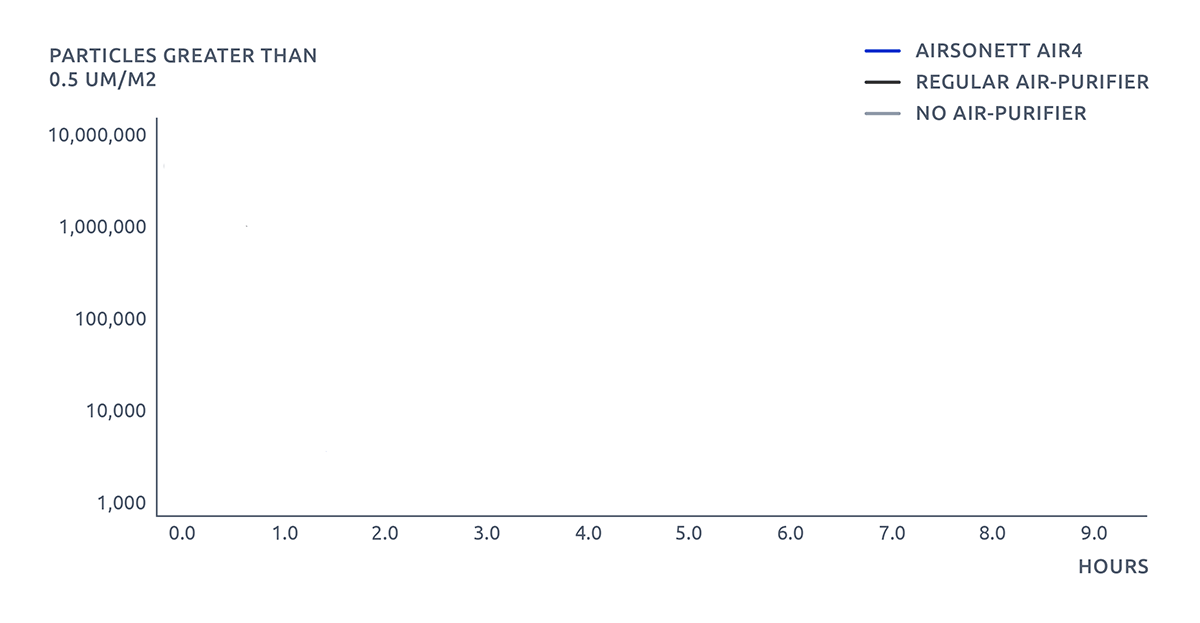 Airsonett Air4 is the only solution that eliminates 99.5% of allergens, dust, bacteria, pollen, pet particles, viruses and other airborne particles. In clinical trials, TLA has proven to be one hundred times more effective compared to air purifiers.